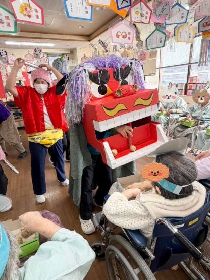 さらに今回は、スタッフ手作りの獅子舞も登場し、会場はさらににぎやかに。なぜか皆さん、豆を“退治”するのではなく、獅子舞に“ごちそう”するように、やさしく差し出してくださる姿も見られ、ほほえましいひと場面となりました。