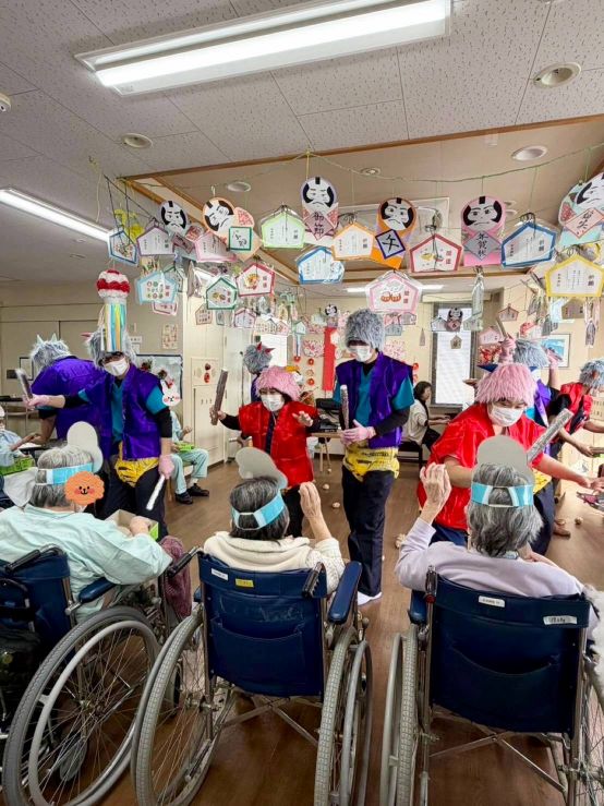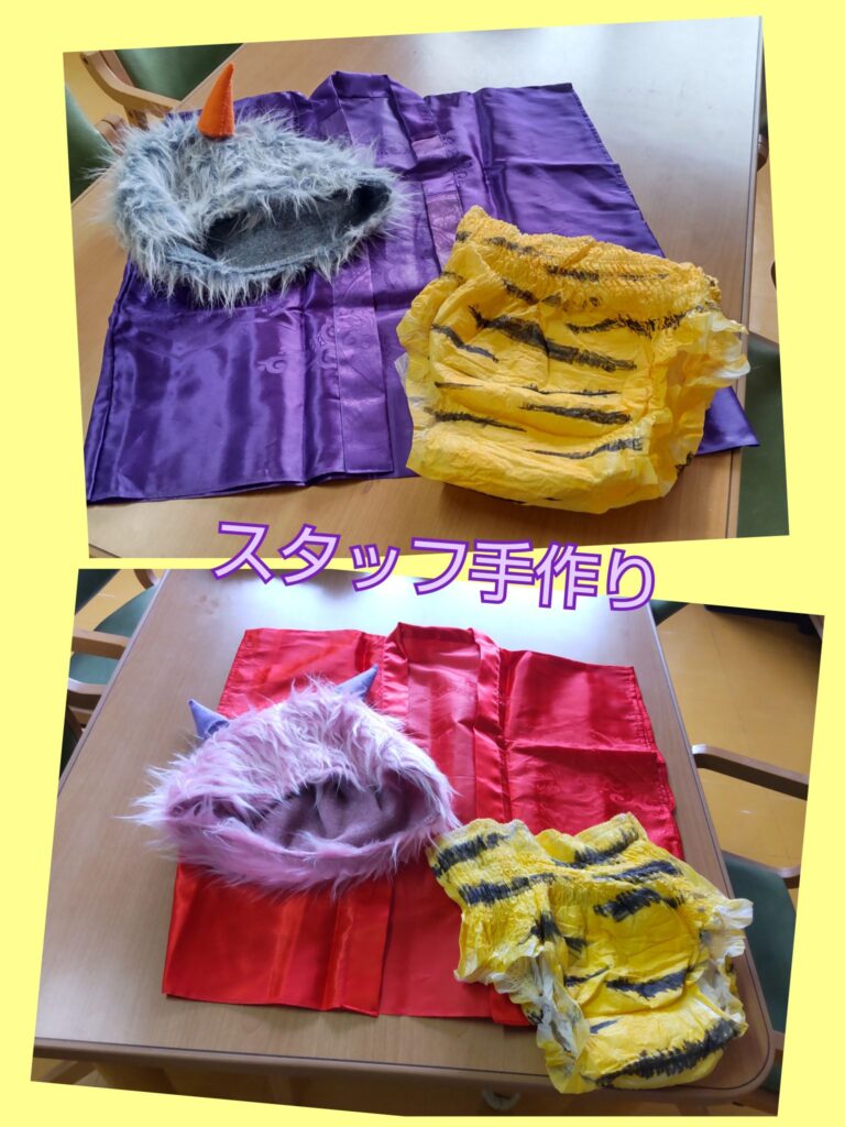 会場には、鬼に変身したスタッフが登場。なんと鬼の衣装はすべてスタッフの手作りです。個性あふれる鬼たちに向かって、患者さんが元気よく豆まき。「鬼は外!福は内!」の掛け声とともに、たくさんの笑顔があふれました。